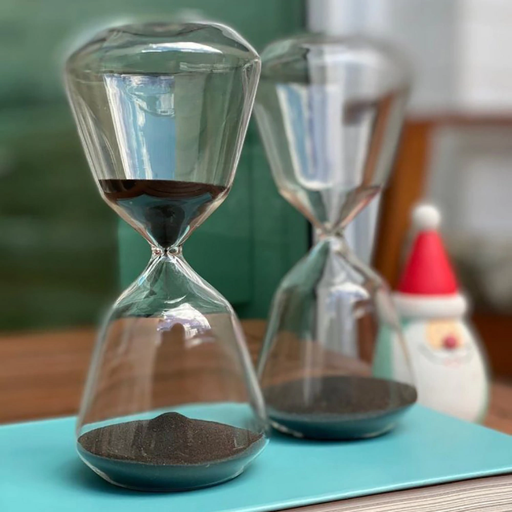 Ampulheta decorativa feito em vidro com a areia na cor preta. Uma peça decorativa super detalhada e delicada, ótima escolha para enfeitar. Objeto decorativo muito sofisticado, imponente, de fácil combinação, se estiver sobre um livro caixa ou bandeja decorativa o charme fica ainda maior!