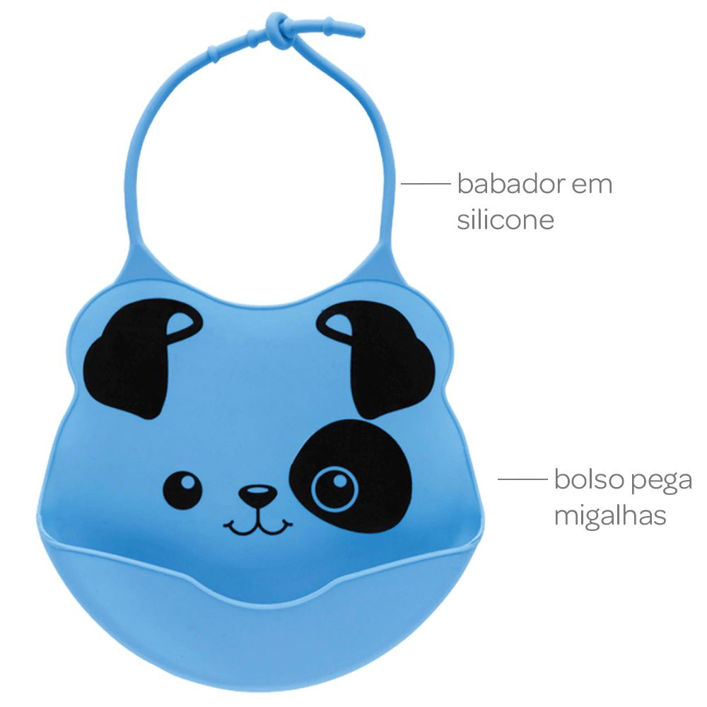 Babador em silicone azul com bolso frontal pega migalhas. Possui fecho ajustável para regular a altura no pescoço/nuca do bebê. Fabricado em silicone super macio para divertir os pequenos, ele é seguro e fácil de lavar e transportar, além de ser totalmente livre BPA.
