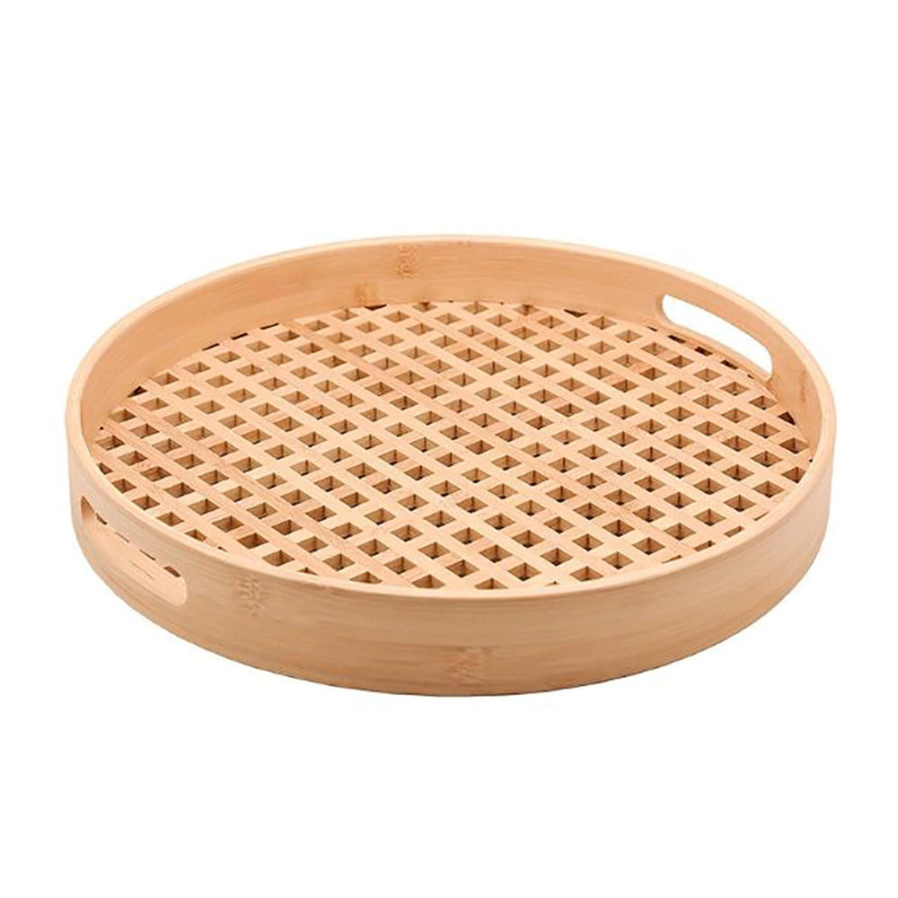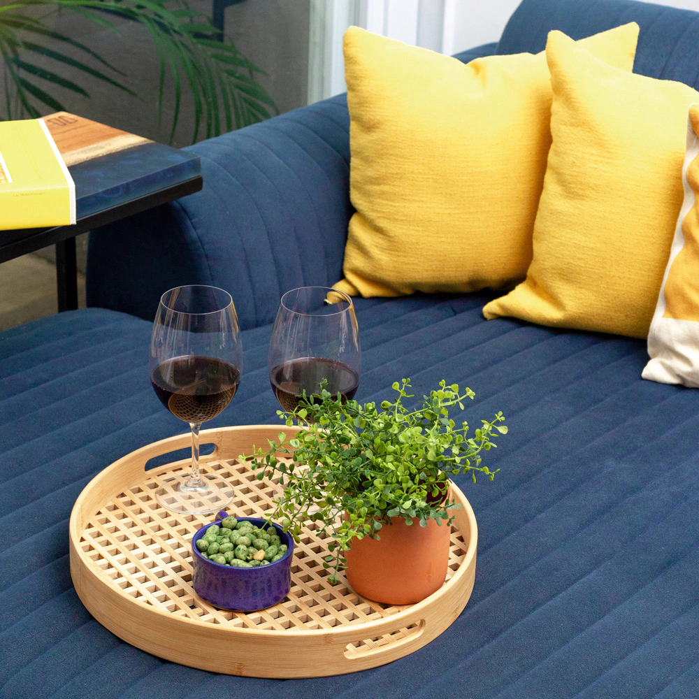 Bandeja redonda em bambu vazada da OIKOS. Multiuso que só ela, pode ser usada tanto para servir comes e bebes, quanto para deixar seus itens organizados. Versátil, ela combina com qualquer lugar da casa. Até pendurada na parede, essa bandeja se dá bem - a mistura do tom natural do bambu com a textura de palha, dá um toque rústico na decoração.