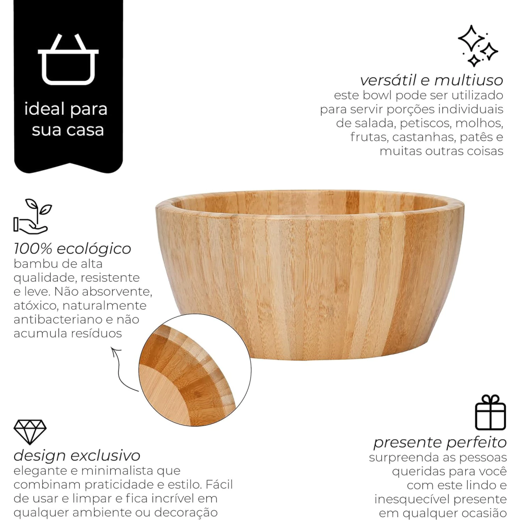 Bowl é um item perfeito para servir amigos e familiares com bom gosto e qualidade. Confeccionada em bambu, possui visual rústico, unindo bom gosto, descontração à sua mesa e garantindo durabilidade, já que o bambu é um material resistente e com agentes bactericidas, que previnem o aparecimento de fungos e bactérias.