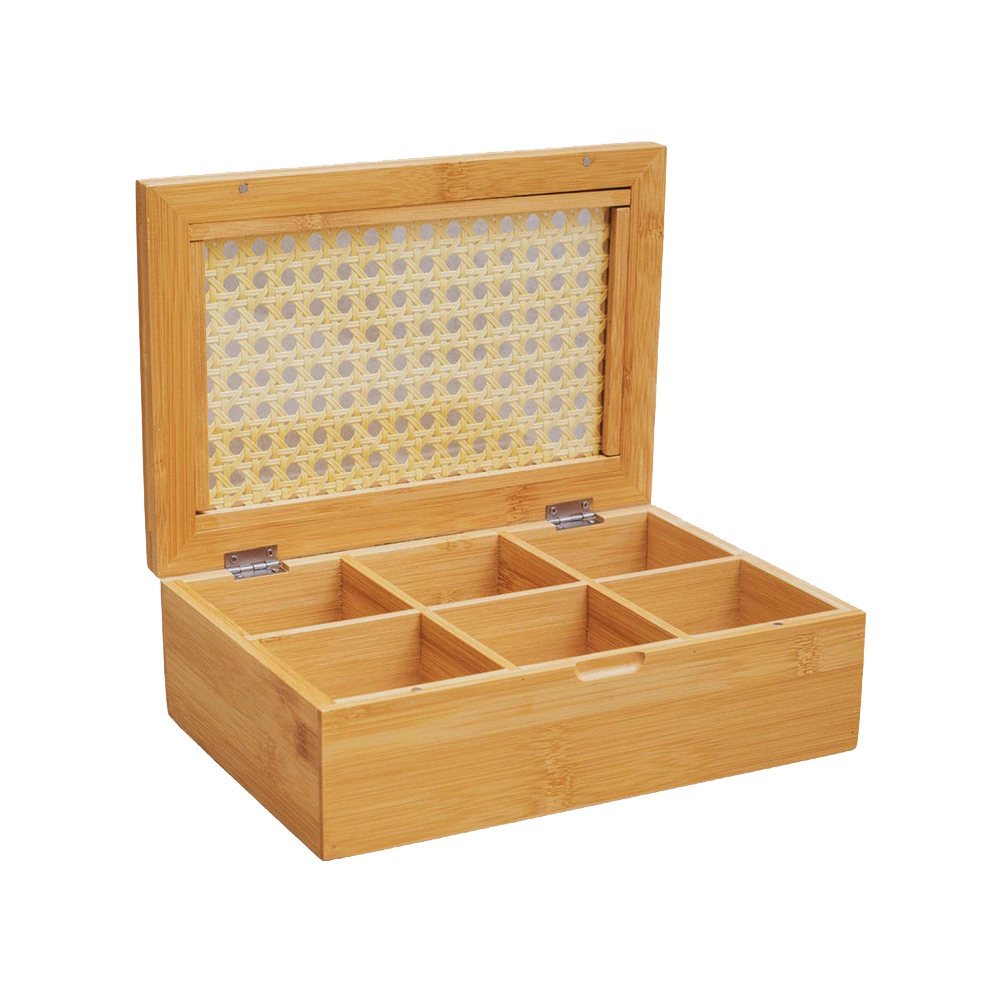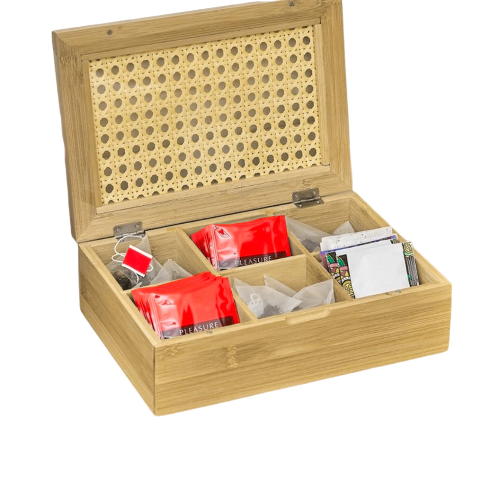A caixa organizadora porta sachês em bambu com palhinha, além de ser ecologicamente correto e não transfere nenhum odor, deixa sua cozinha e o lugar do cafezinho organizado, elegante e prático. Possui alta resistência, comporta sachês como chá e açúcar.
