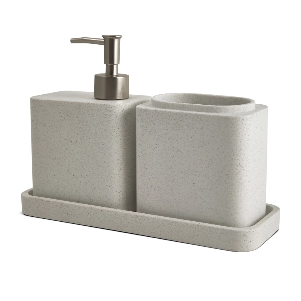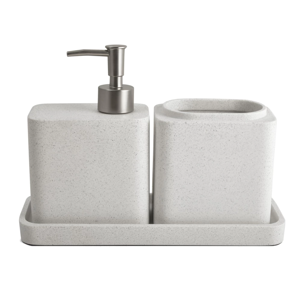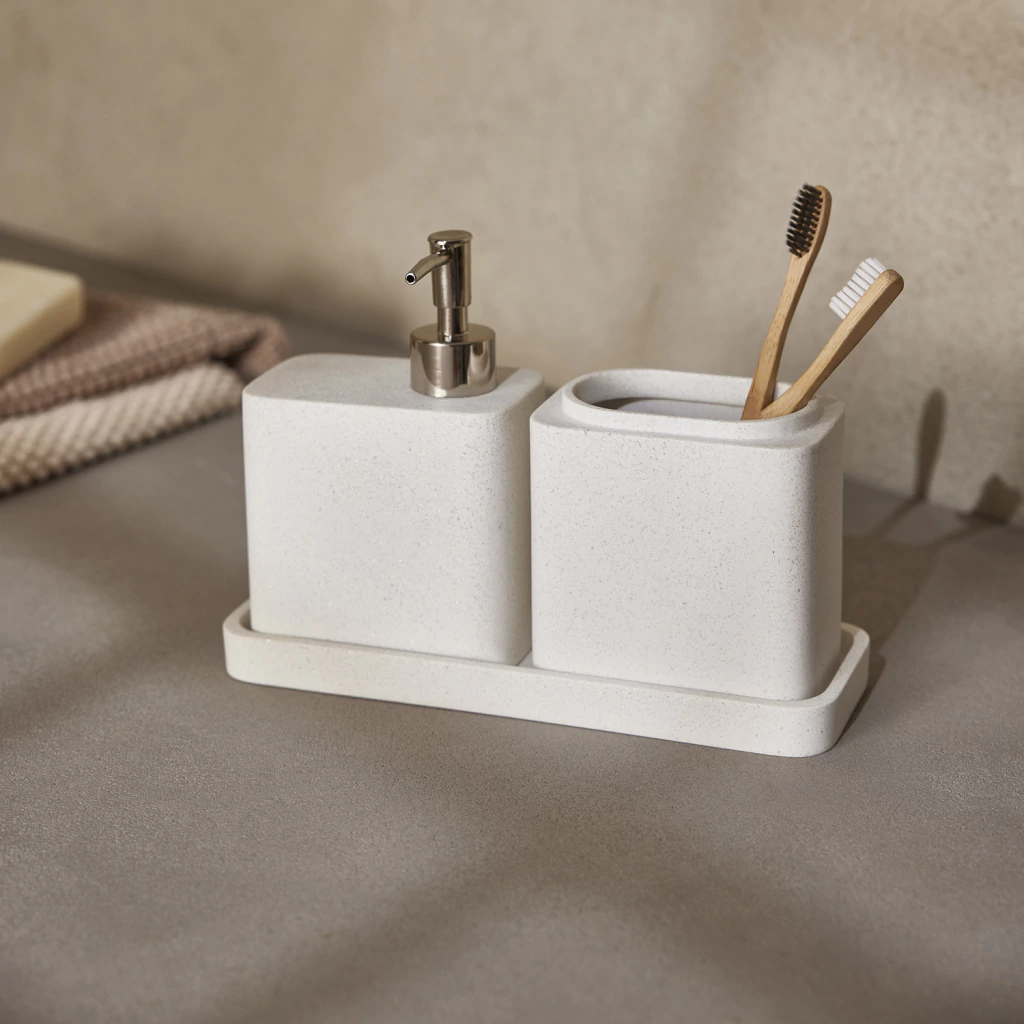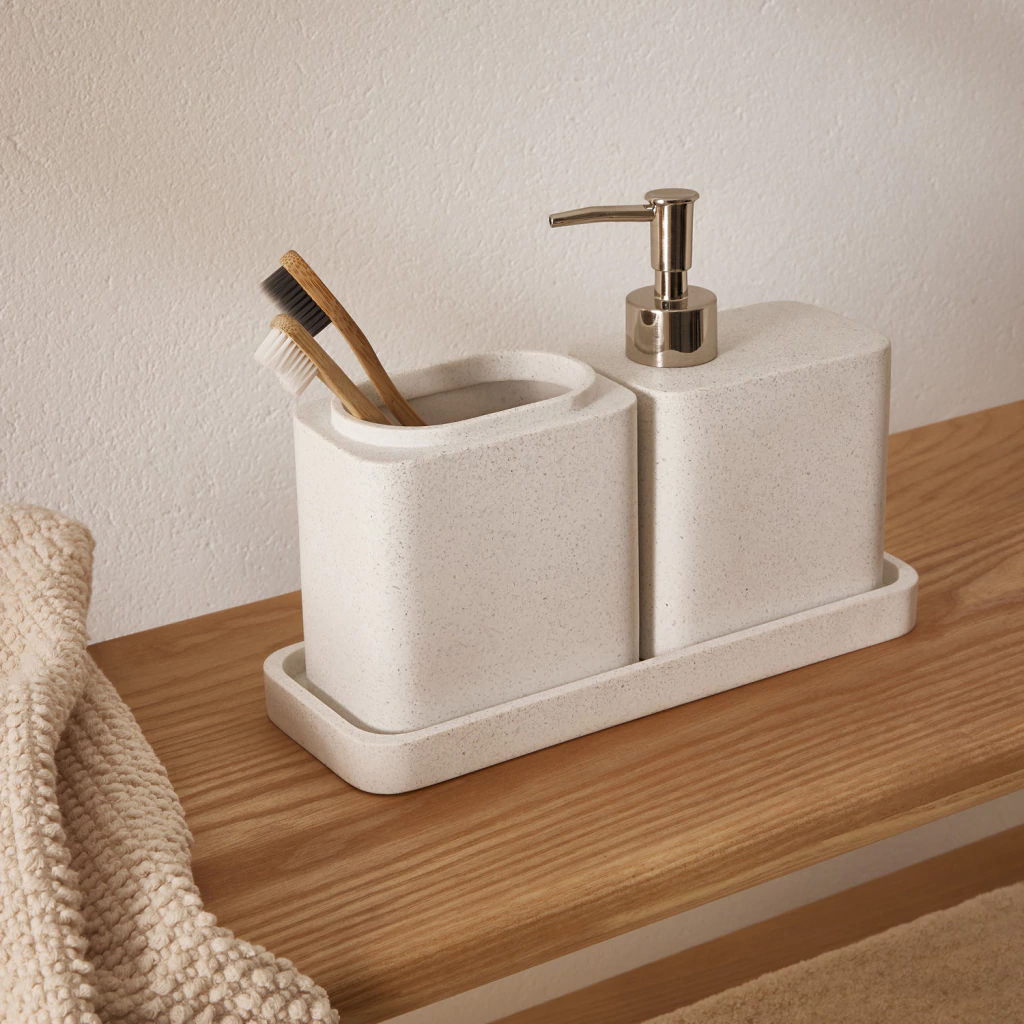 Renove a decoração do seu banheiro ou lavabo com o Conjunto Banheiro Lumina Rounded da Mart Collection. Este kit sofisticado combina design clean com funcionalidade, transformando pequenos detalhes em momentos especiais. Composto por um dispenser de sabonete líquido, um copo porta-escovas e uma bandeja decorativa, ele oferece uma solução completa para organizar e enobrecer o ambiente, criando a sensação de um spa particular.