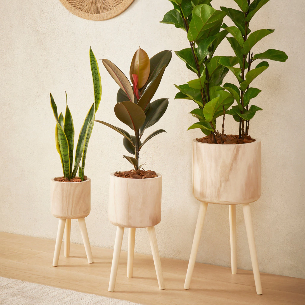 Cachepot tripé em madeira proporciona elegância para o ambiente e dá aquela sensação de bem-estar ao lar. Composto com o verde das plantas, cria um lugar verde, intimista e cheio de vida.