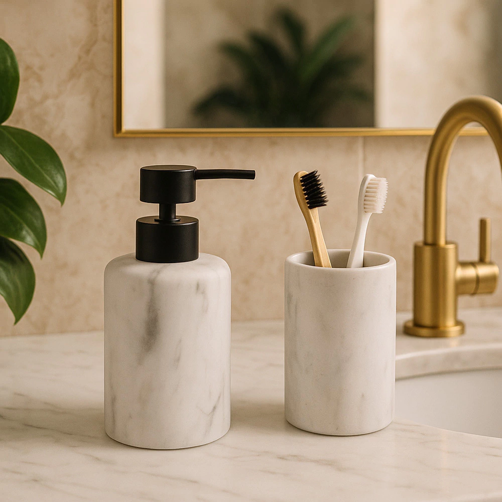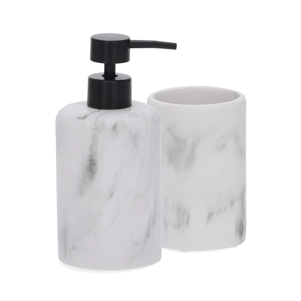 Transforme seu banheiro com elegância e sofisticação com o Kit Mármore Carrara da Mart Collection. Composto por um dispenser para sabonete líquido e um copo porta-escovas, ambos com acabamento marmorizado e formato cilíndrico moderno, este conjunto traz praticidade e estilo para o seu ambiente. Ideal para banheiros, lavabos ou espaços corporativos com decoração refinada.