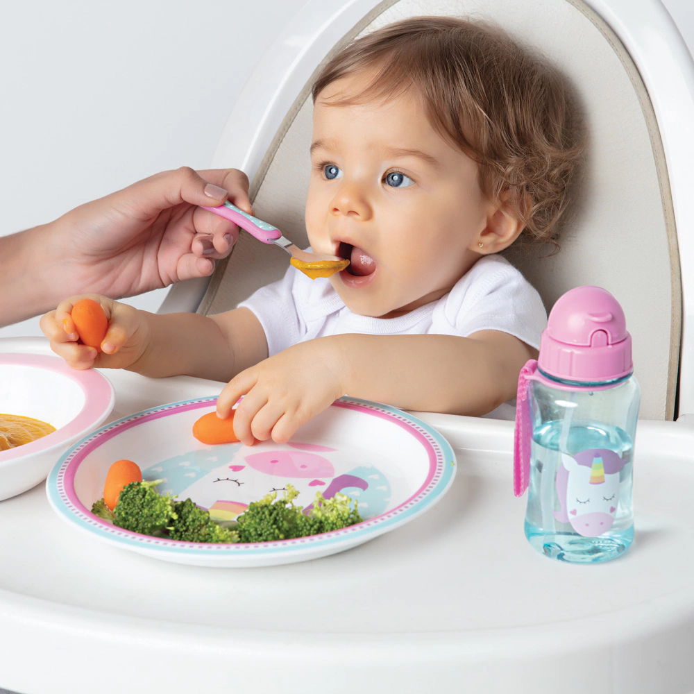 Garrafa Animal Fun, Buba. Com estampa de Unicórnio, a garrafinha Animal Fun ajuda no momento da transição da mamadeira para o copo. Possui canudo extra, proteção de tampa flip-top e pulseira com velcro. Não vaza. A linha de alimentação da Buba traz itens práticos que facilitam a vida das mamães e dos papais, acompanhando as diversas fases das crianças e contribuindo para um crescimento saudável.