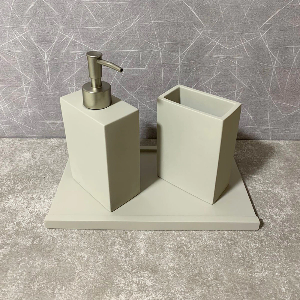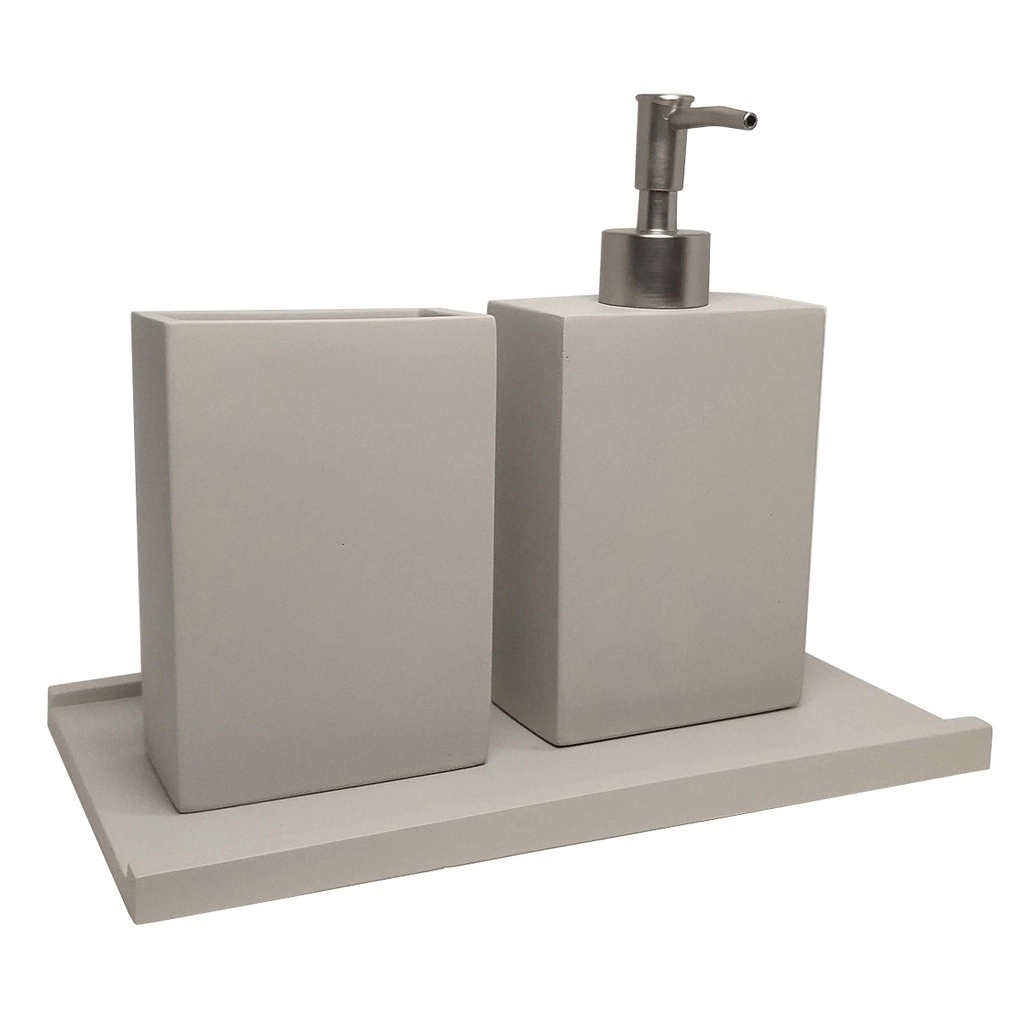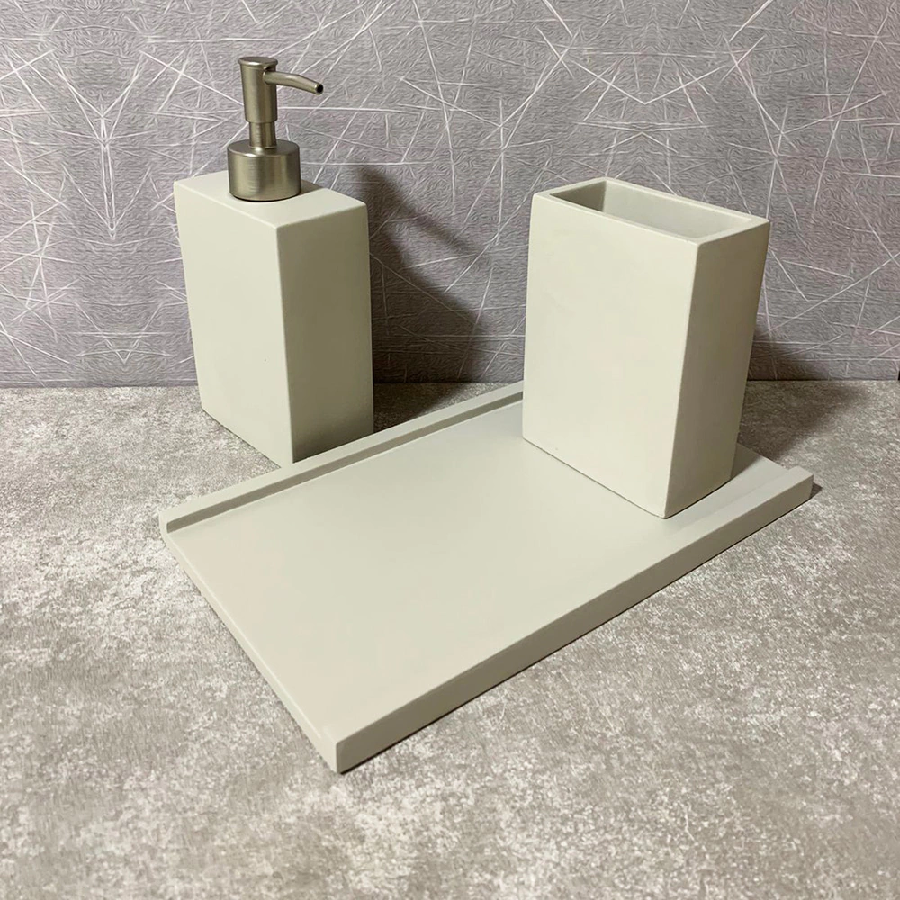 O jogo de banheiro da mart, é produzido em cimento um material resistente, de aspecto neutro, cuja modernidade irá renovar o visual do ambiente. O jogo é composto por 3 peças essenciais para organizar, porta sabonete liquido, porta escovas e uma bandeja de 26 cm.