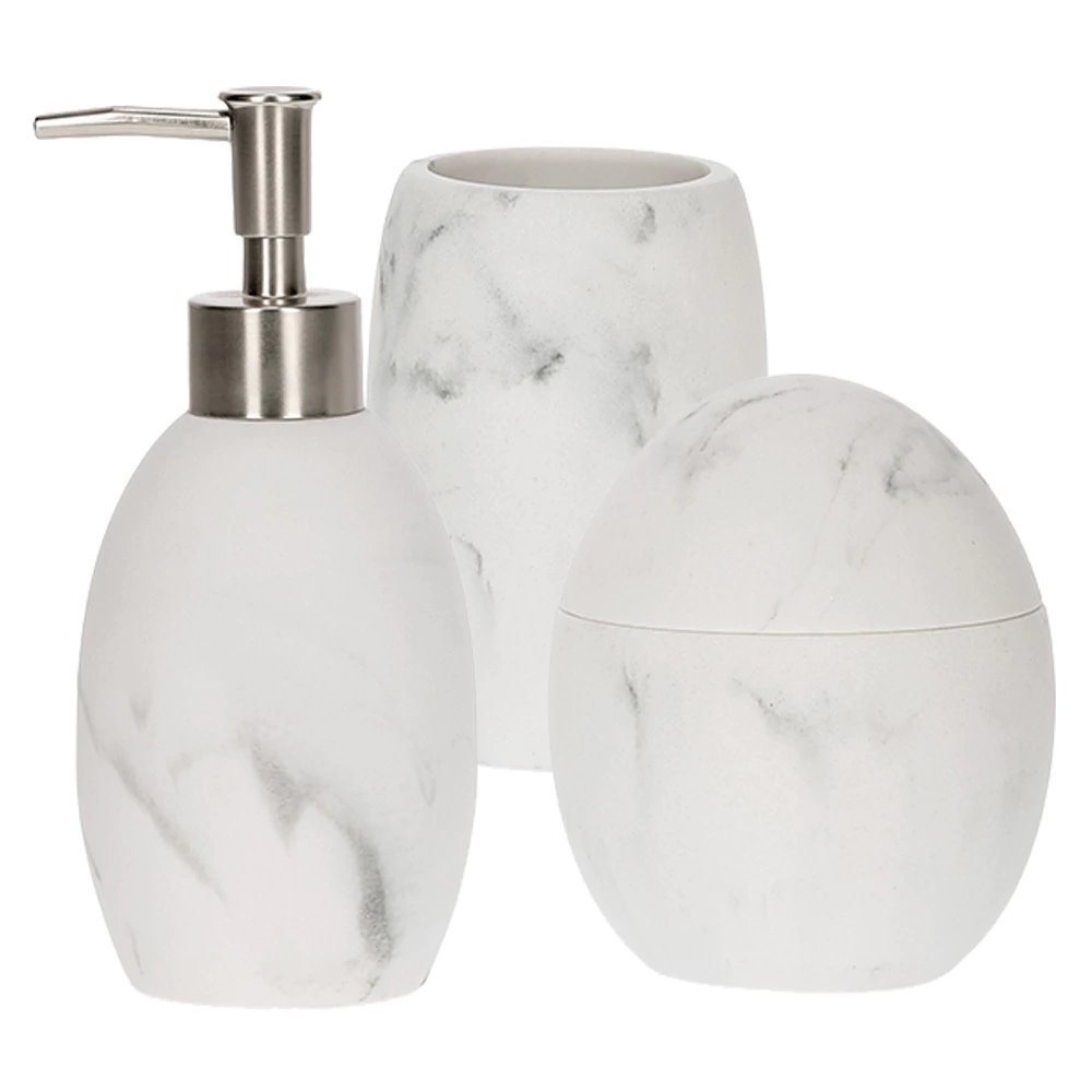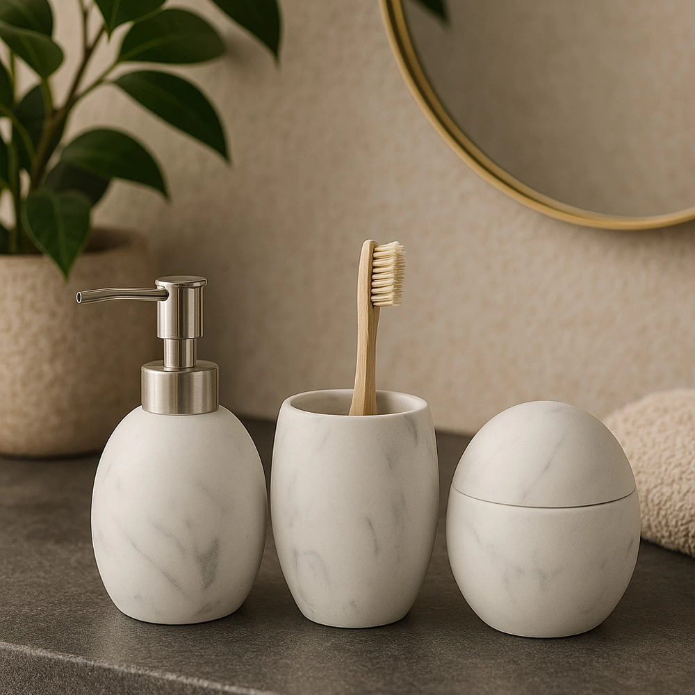 O Jogo de Banheiro Elementos da Mart Collection combina sofisticação e funcionalidade em um conjunto moderno com acabamento marmorizado. Ideal para quem deseja adicionar elegância e organização ao banheiro ou lavabo, esse kit em polirresina é durável, fácil de limpar e perfeito para o uso diário. Uma escolha charmosa e prática para transformar pequenos detalhes em grandes destaques na decoração.