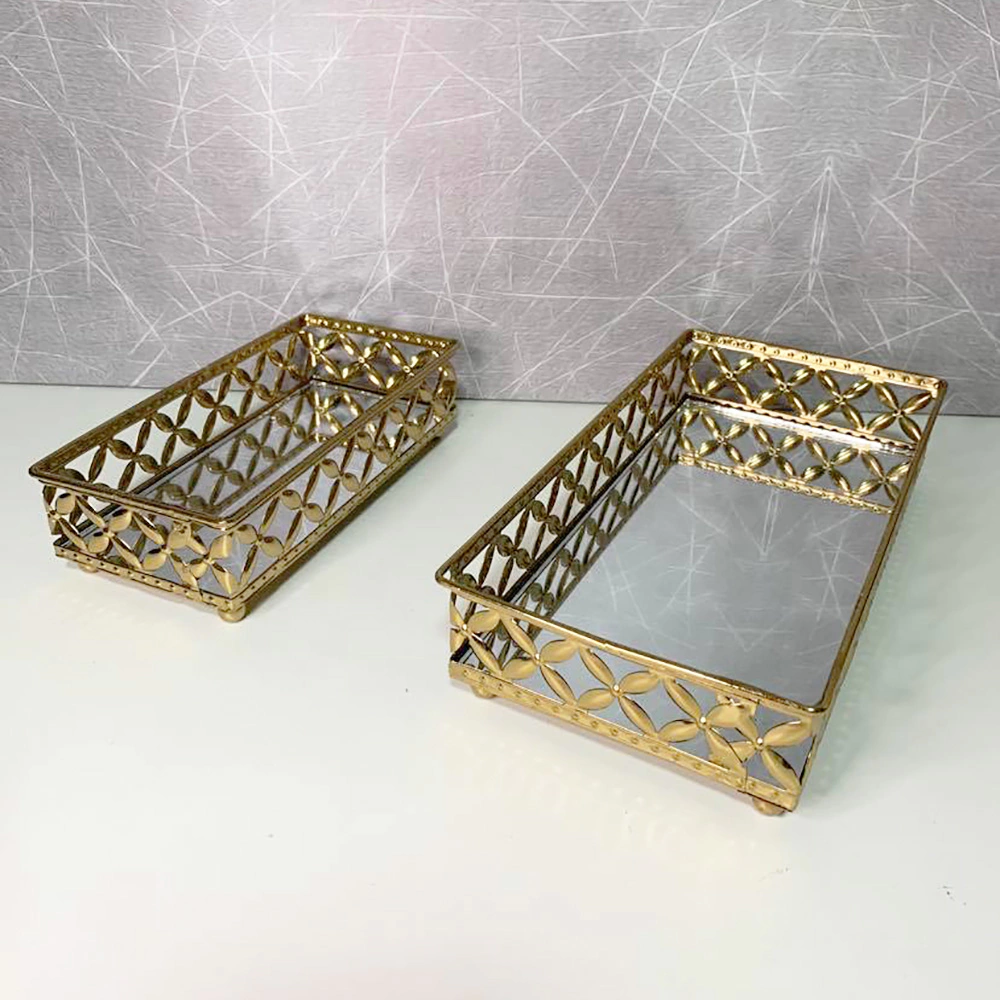 Kit Bandeja Dourada Espelhada, pode ser usada nos banheiros, especialmente os mais compactos, onde o uso de bandejas pode ajudar na organização e aproveitamento do espaço.