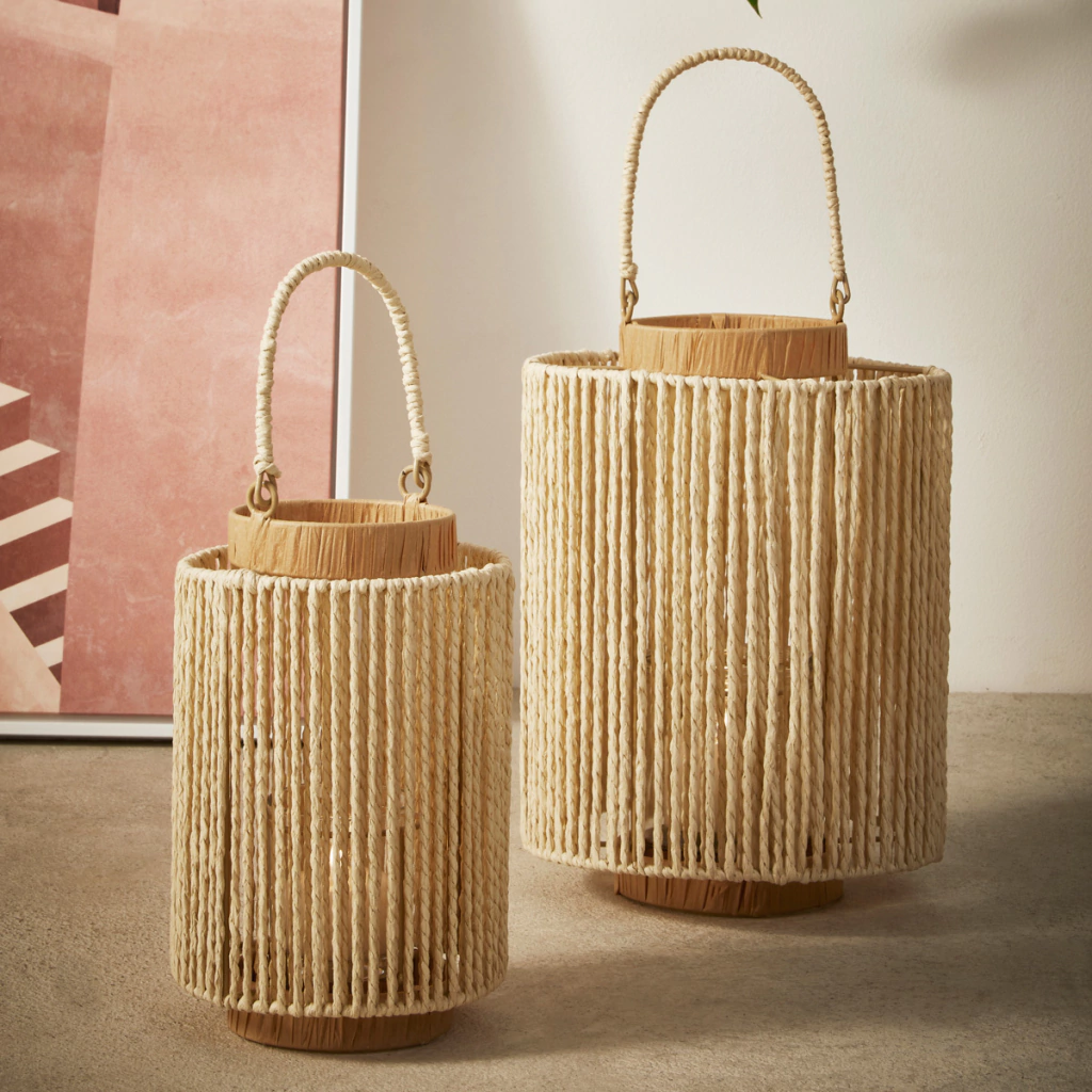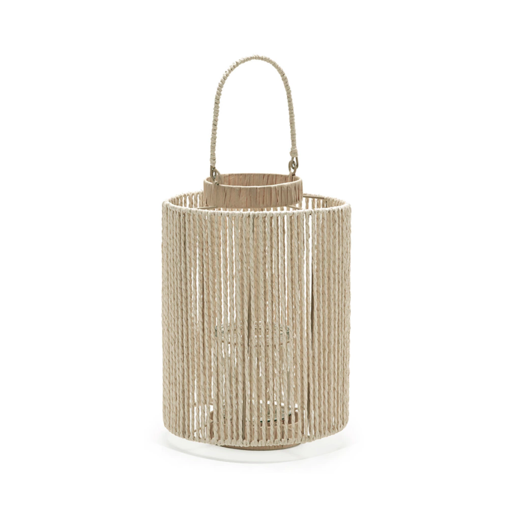Essa lanterna da Mart apresenta diversas linhas verticais na sua estrutura, com a base de metal e pegador enrolado por fibras naturais.