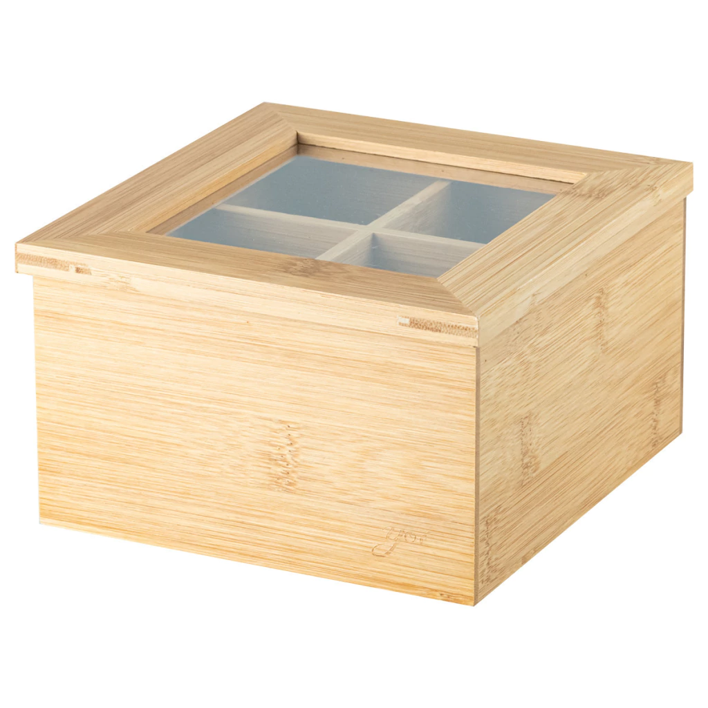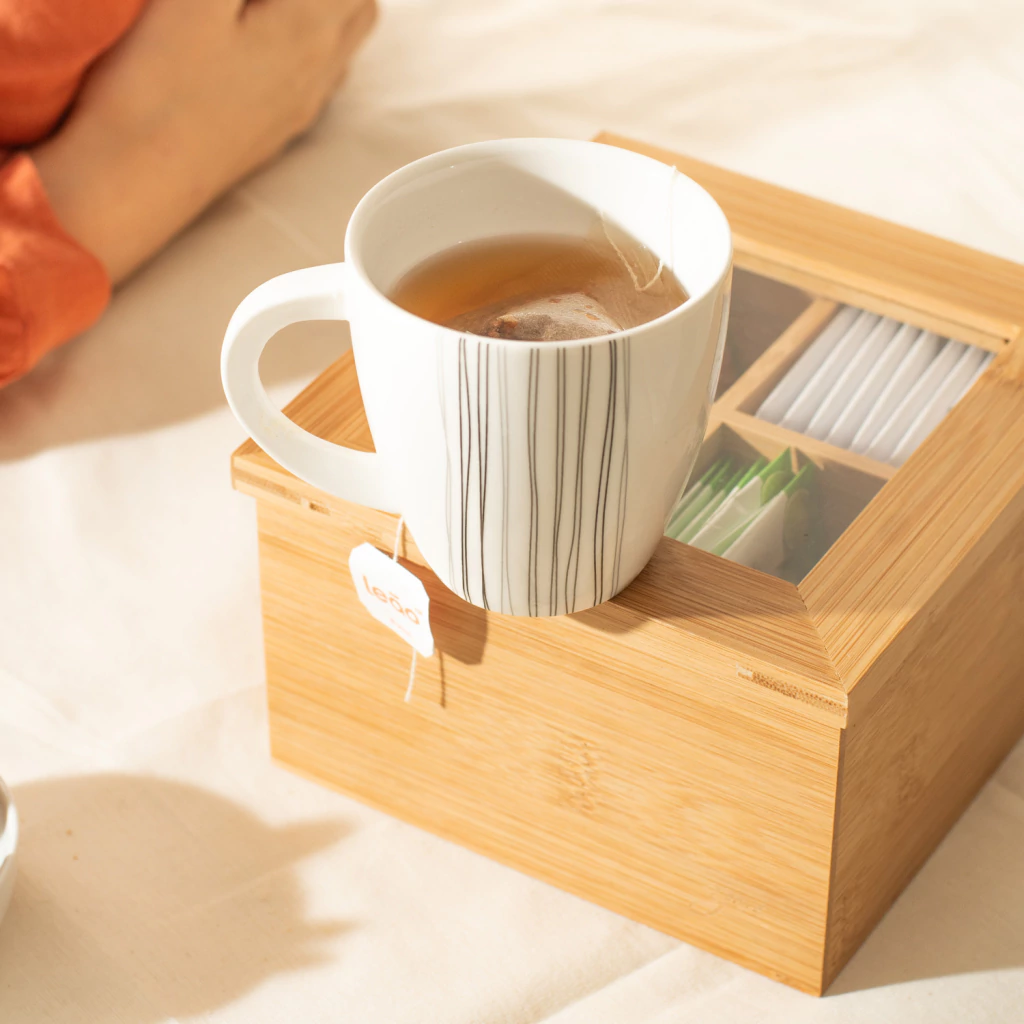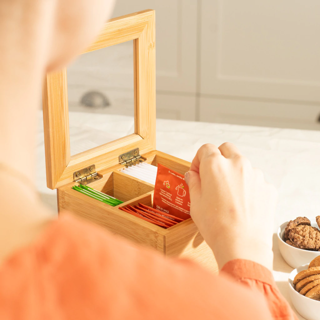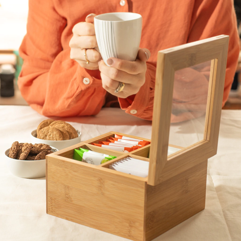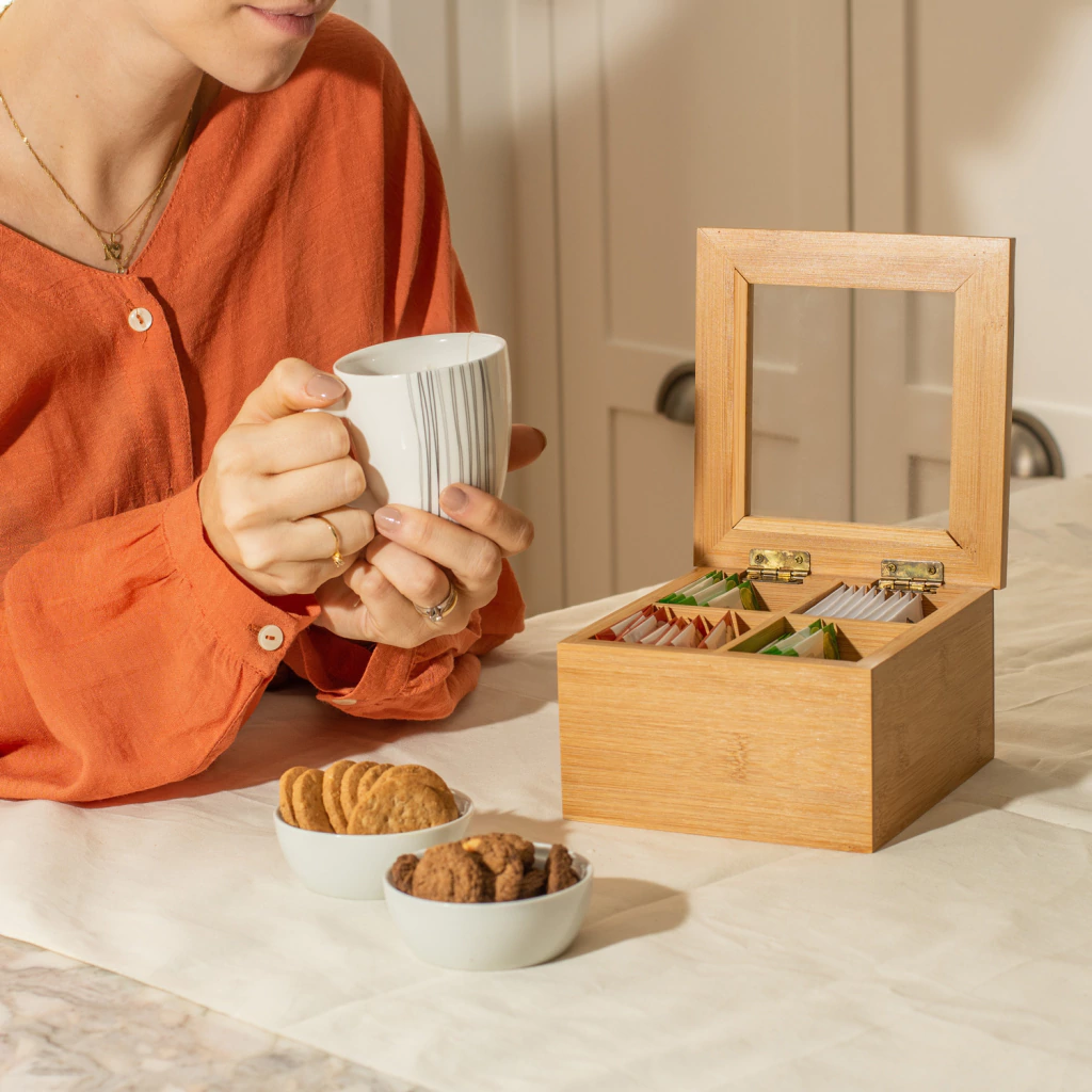 O Organizador de Chá Sense traz praticidade e sofisticação à sua cozinha ou área de serviço. Com 4 divisórias e tampa de visor transparente, ele facilita a organização e visualização dos sachês de chá, mantendo tudo em seu devido lugar e à mão. Feito de bambu, material sustentável e elegante, é ideal para quem valoriza um ambiente mais organizado e esteticamente agradável. Perfeito para quem gosta de servir chá com estilo, ressignificando a experiência de servir e decorar.