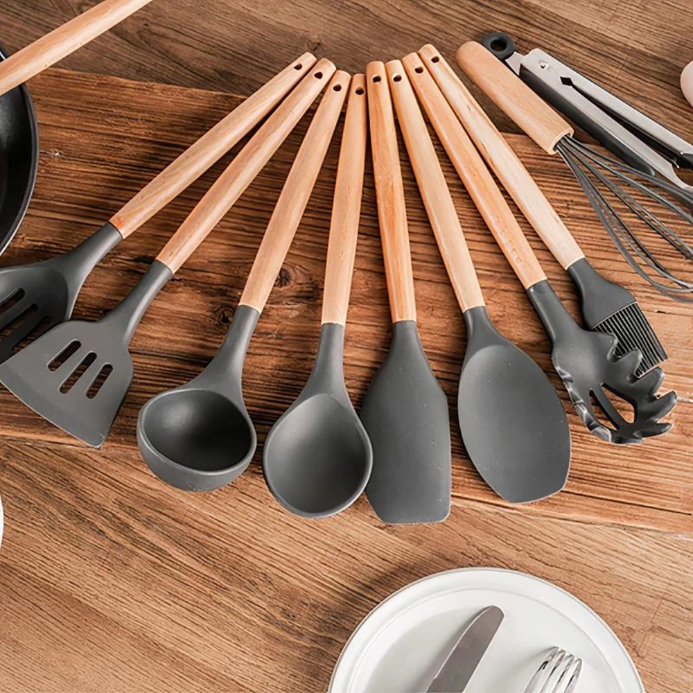 Pegador de massa de silicone na cor Preto com cabo em bambu, trazendo o melhor do estilo escandinavo para sua cozinha. Sucesso na cozinha gourmet e também na decoração.