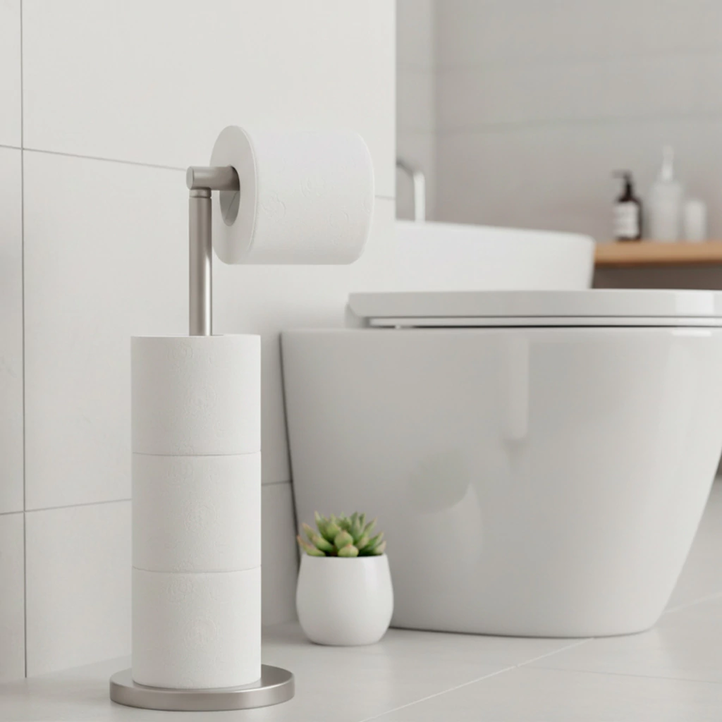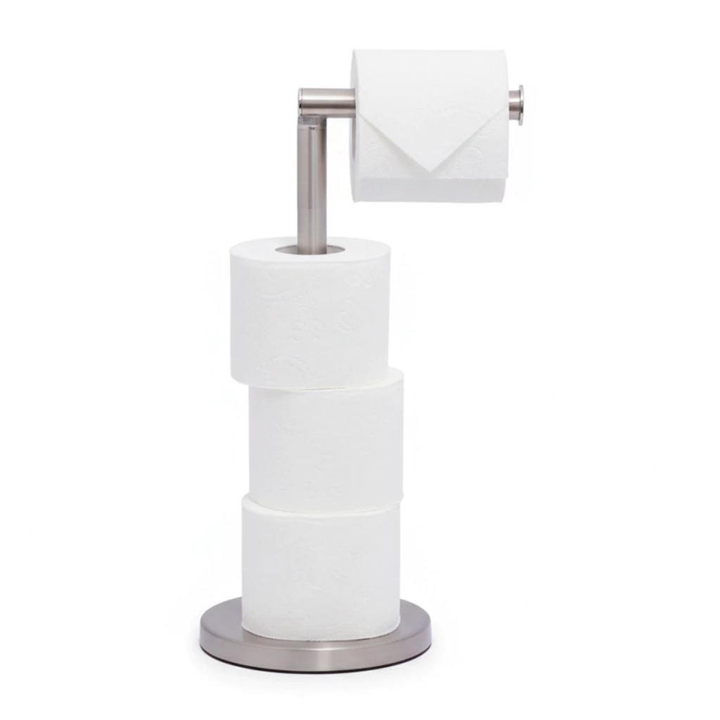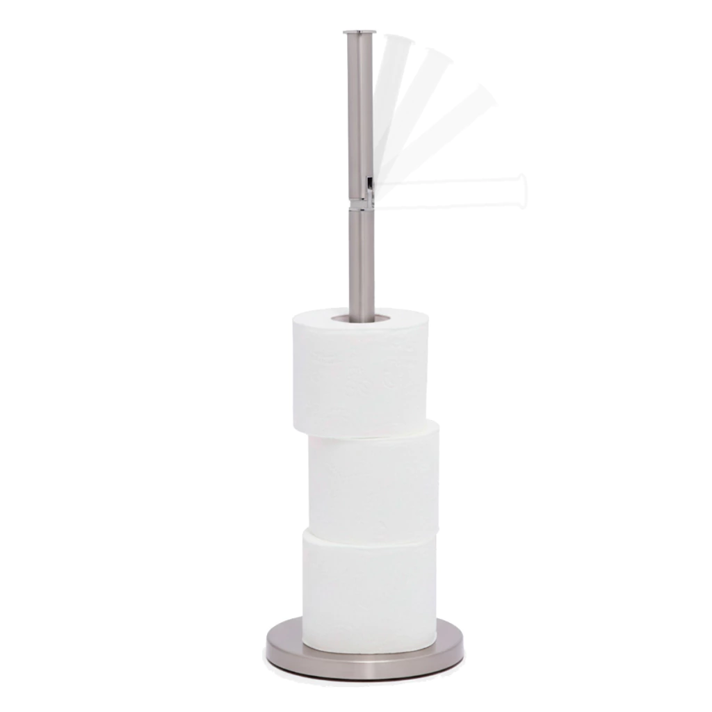 Com estrutura firme e estável, o suporte possui articulação no eixo principal, permitindo repor o rolo de uso com facilidade e acomodar até 3 rolos extras na haste vertical. Ideal para manter o banheiro sempre organizado, é uma solução prática e de visual refinado para quem busca funcionalidade e estilo em um só produto.