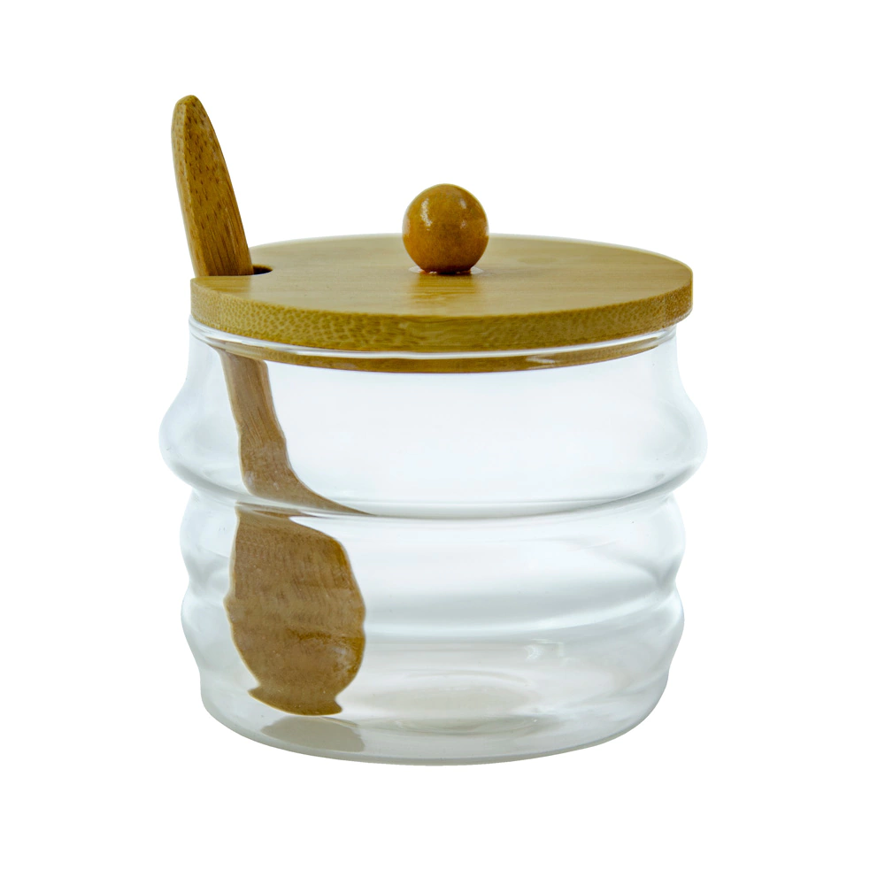 Lindo e delicado açucareiro em vidro super incolor com tampa e colher em bambu.