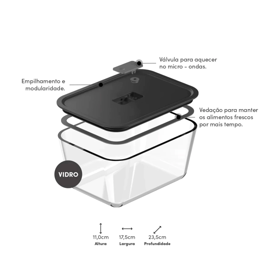 O Pote de Vidro Hermético Fresh Lock da OU é perfeito para todas as etapas do preparo e armazenamento das suas refeições. Feito de vidro borossilicato, ele suporta temperaturas de até 220°C, permitindo o uso em fornos, air fryers e micro-ondas. Com capacidade de congelamento a até -20°C e compatibilidade com lava-louças, ele é durável, resistente a manchas e odores, e totalmente livre de BPA. Prático e seguro, este pote é ideal para quem valoriza uma alimentação saudável e armazenamento de qualidade.