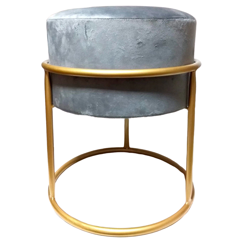 Puff com base em metal dourado e assento com tecido veludo de suede na cor cinza