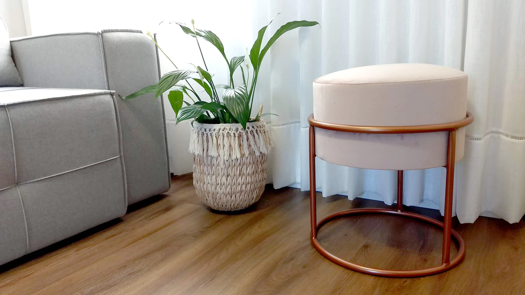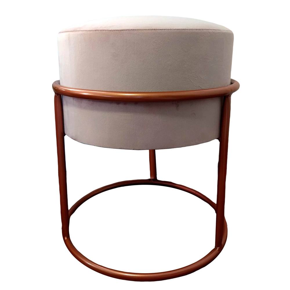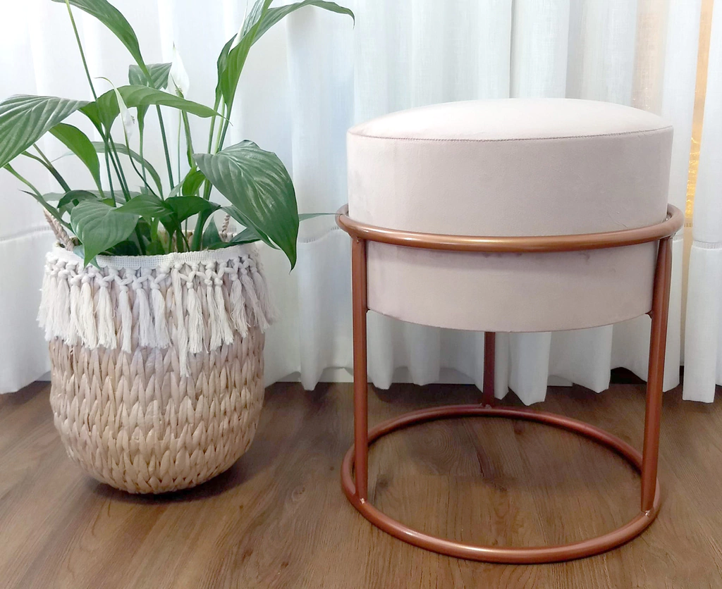 Puff com base em metal Rose Gold e assento com tecido veludo de suede na cor Rosé