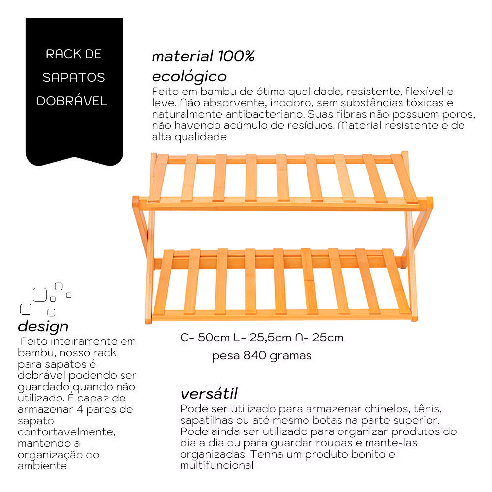 Mantenha a organização e praticidade do seu ambiente com o Rack de Sapatos Dobrável da Mimo Style. Feito inteiramente em bambu, é ecológico, resistente e fácil de guardar quando não está em uso.