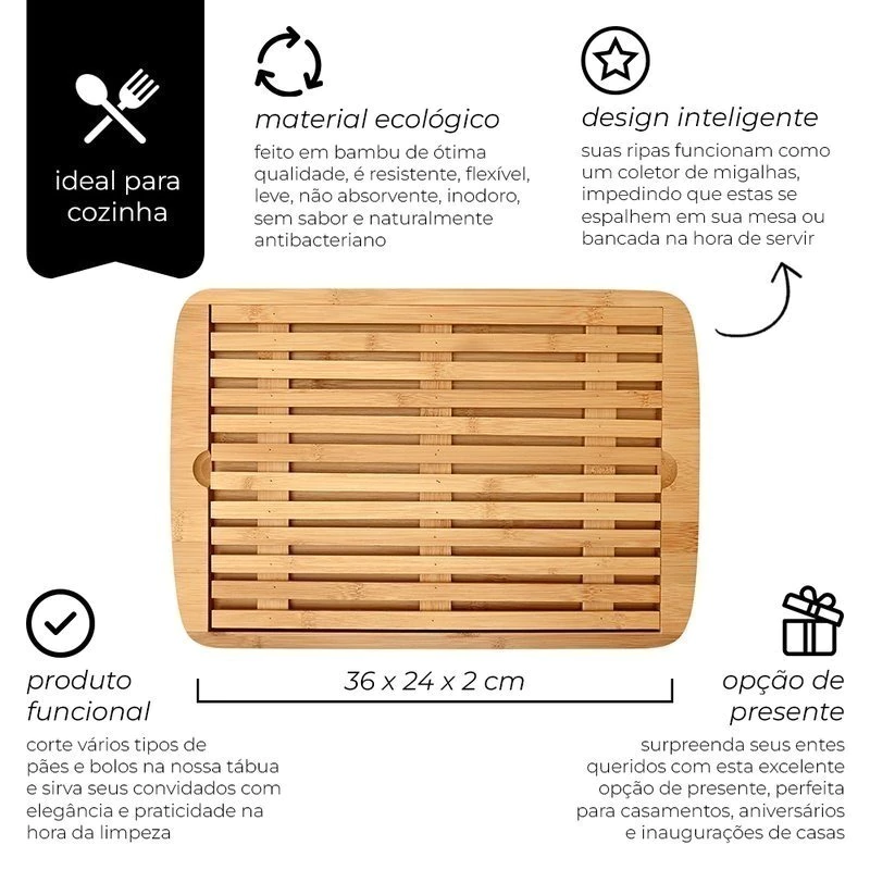 Deixe sua cozinha mais charmosa, bonita e moderna com a tábua para pães em bambu. Um objeto indispensável para a sua cozinha que facilita os cortes dos pães sem tirar o fio da lâmina.